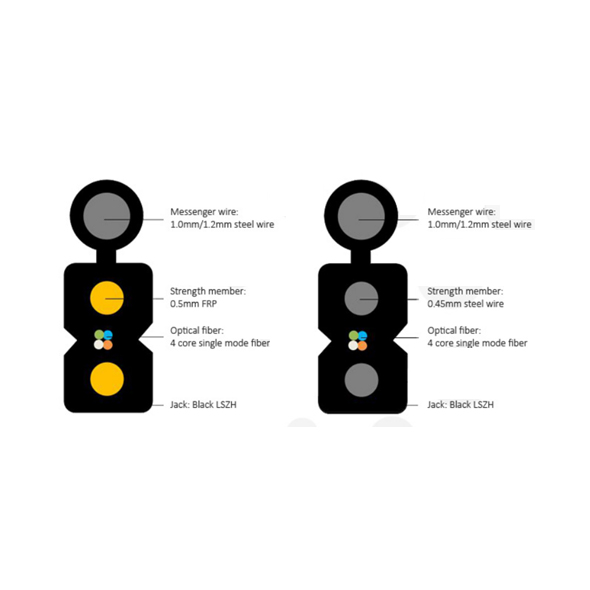 The optical fiber unit is positioned in the center. Two parallel Fiber Reinforced Plastic (FRP) or steel wire are placed at the two sides. A steel wire as the additional strength member is also applied. Then the cable is completed with a black LSZH sheath.